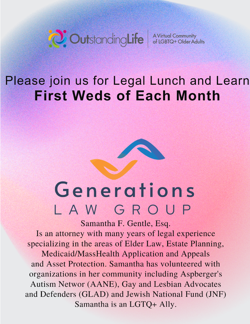 Welcome back to OutstandingLife's Legal Lunch & Learn Series with Generations Law Group, offering tailored legal conversations to LGBTQ+ older adults in the OutstandingLife community! Topics vary each week.