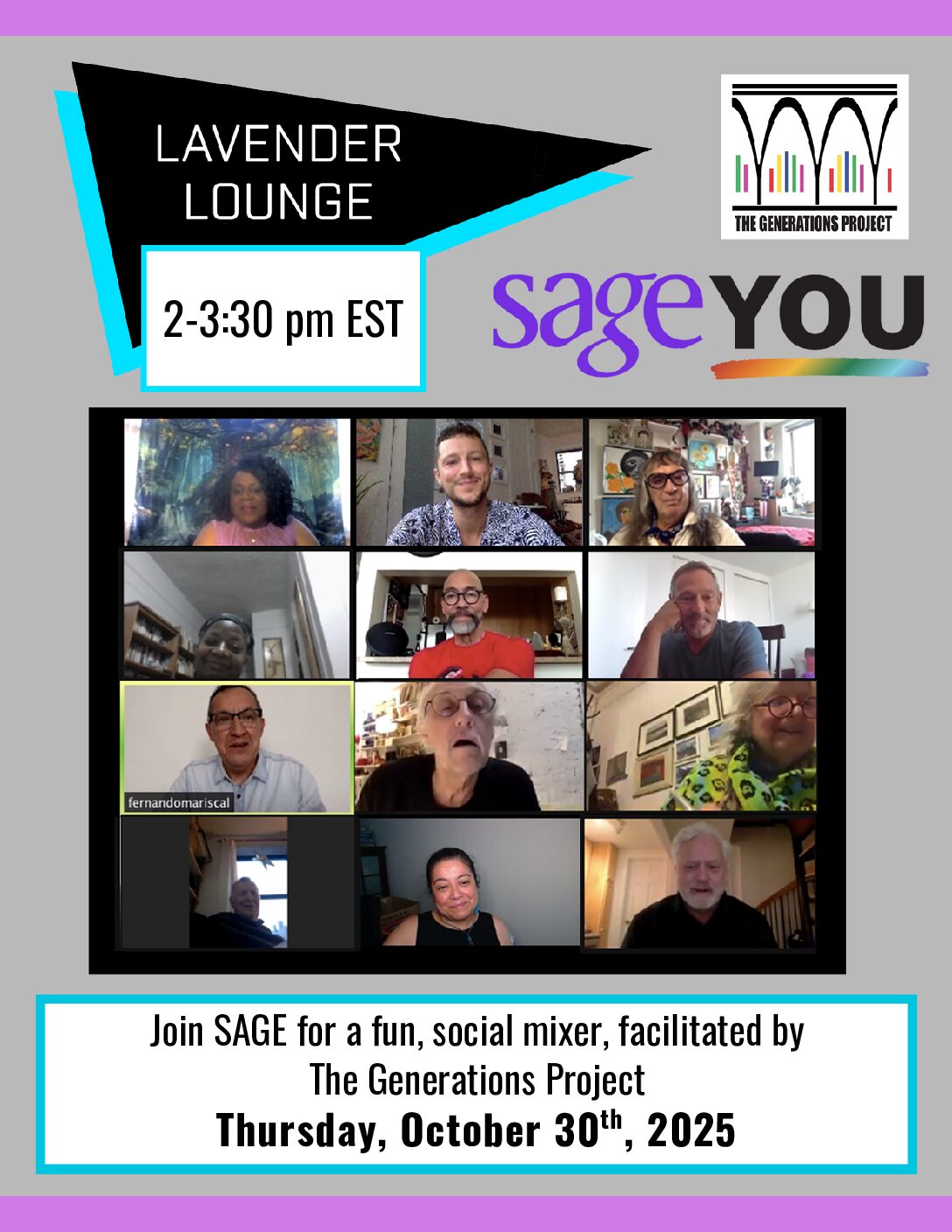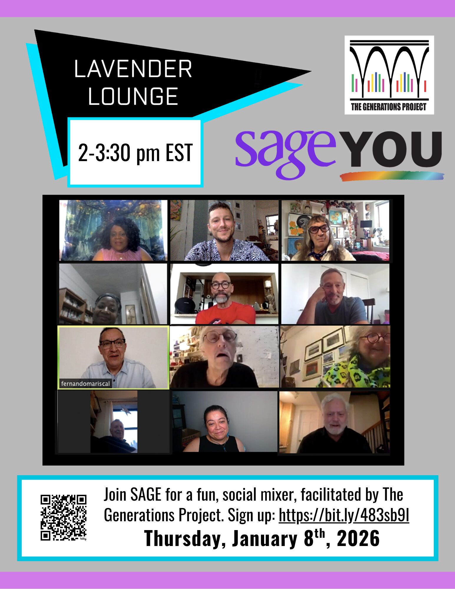 Join the SAGE community of LGBTQ+ elders for a fun, social mixer facilitated by The Generations Project. Lavender Lounges feature reflection prompts and guided small group discussions in Zoom breakout rooms. Build connection and get to know the SAGE community!