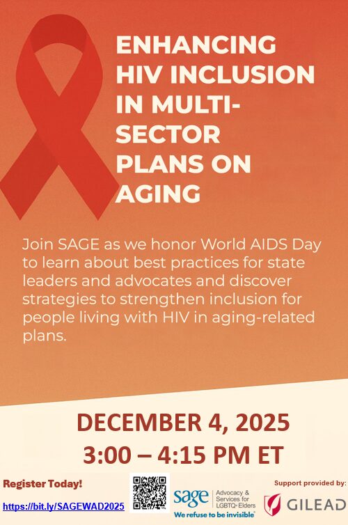 In honor of World AIDS Day, SAGE invites you to join us for a special webinar, Enhancing HIV Inclusion in Multisector Plans on Aging. This session will focus on best practices for state leaders and advocates and explore strategies to strengthen inclusion of people living with HIV in aging-related plans.
