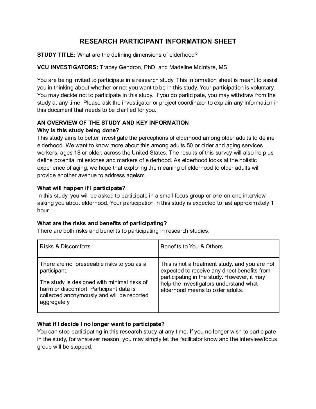 You are invited to participate in a research study to explore the perceptions of elderhood among older adults and aging services workers. To be included in a focus group, participants must be 50 years or older and live in the United States. The focus group will take about 1 hour to complete. Your participation is completely voluntary and there are no costs associated with participating.